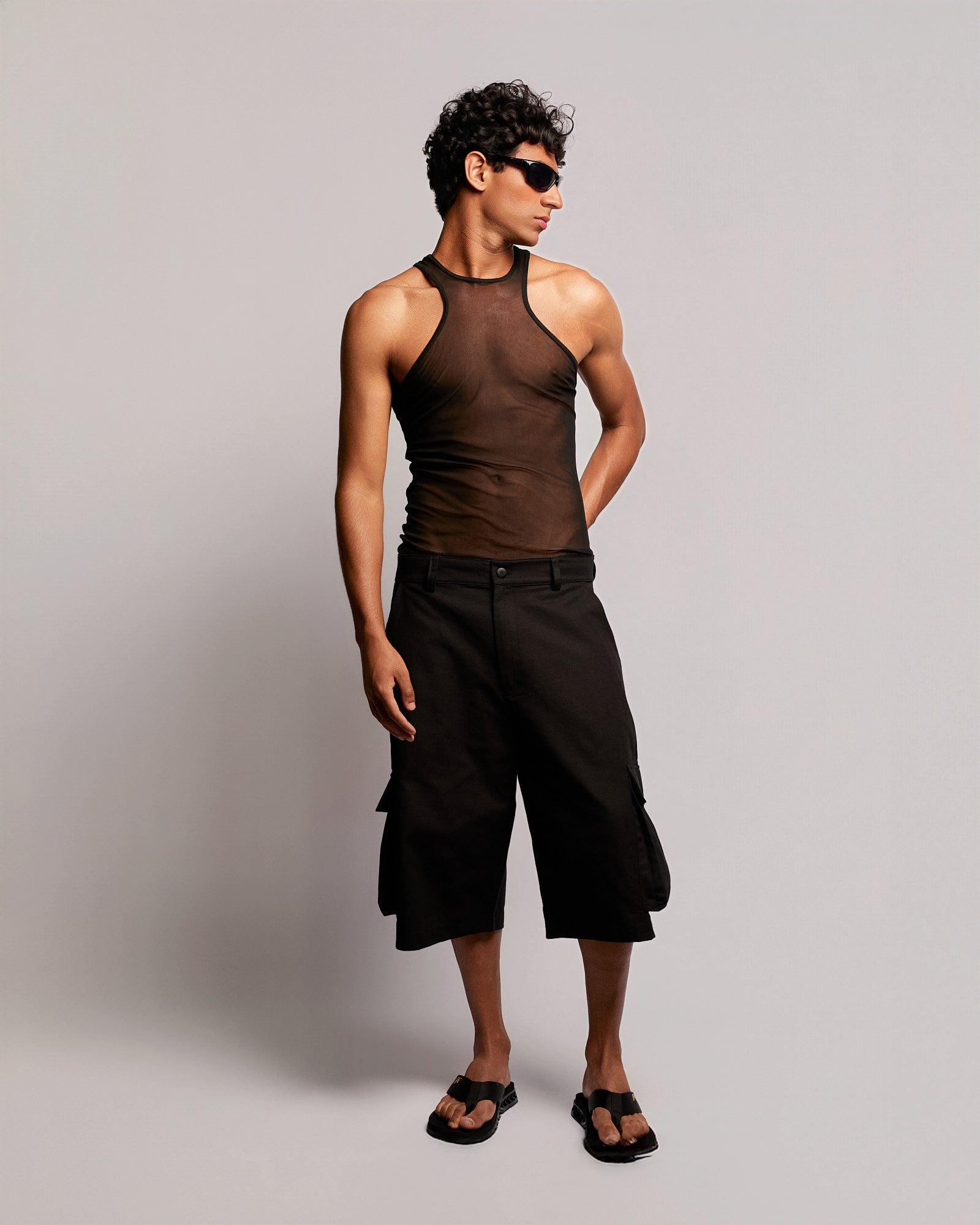 The High-Neck Tulle Tank Top features a fitted silhouette with a distinctive armhole design that contours the chest and rises into a higher neckline. Crafted from lightweight, highly breathable tulle, the fabric’s stretch provides comfort and freedom of movement. Finished with a raw cotton label.